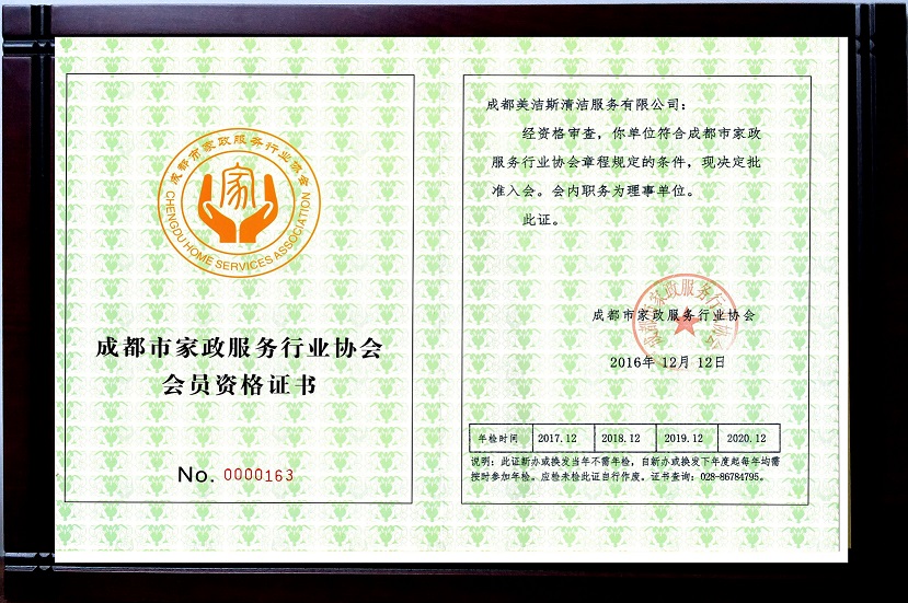 成都市家政服務(wù)行業(yè)協(xié)會(huì)會(huì)員資格證書